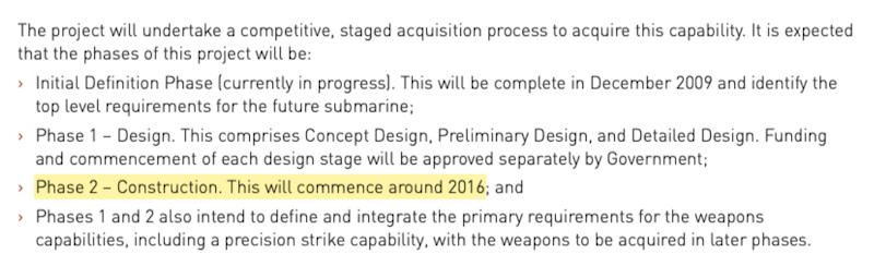 Dumb ways to buy – delay the startSensibly, the future submarine project was first stood up in 2009. The plan was to work through the purchase options and commence construction of the first futures submarine in 2016, with the first boat hitting the water well before 2025, when the first of the ageing Collins Class submarines was due to retire.