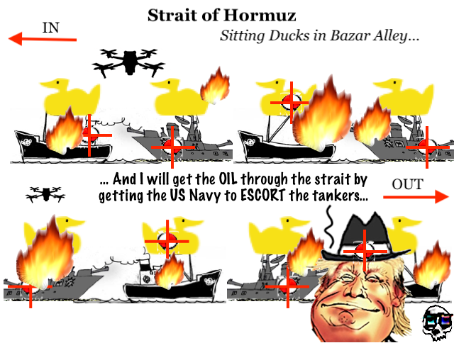 The deployment of Navy escorts into the Strait of Hormuz — just 21 miles wide at its narrowest point, within range of Iranian anti-ship missiles and drones — raises the prospect of the sinking of American vessels and major US casualties.