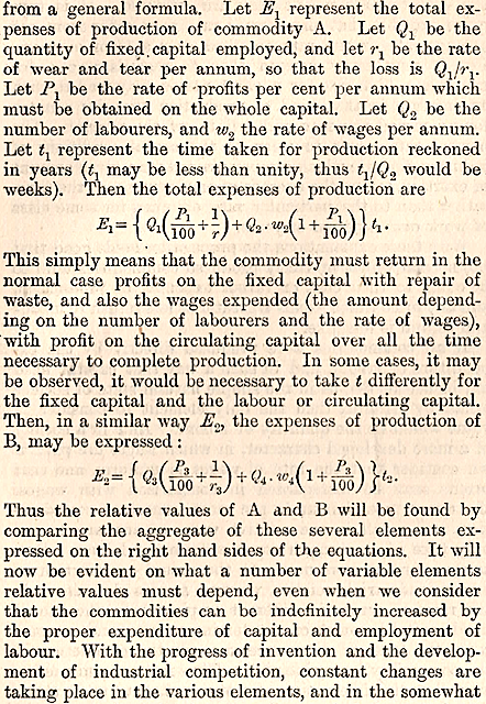 VALUE: [1888 ENCYCLOPAEDIA BRITANNICA] In most departments of economic theory it is convenient to use as the basis of the exposition the opinions of J. S. Mill, not only because he has embodied in his treatise in a remarkable manner nearly everything of importance from the theoretical standpoint in the work of his predecessors, but also because most of the recent advances in economic science have been made by way of criticism or development of his views. This observation is especially true of the theory of value. In this subject Mill had digested the mass of previous learning with such effect that he commences his treatment with the remark : "Happily there is nothing in the laws of value which remains for the present or any future writer to clear up the theory of the subject is complete. The only difficulty to be overcome is that of so stating it as to solve by anticipation the chief perplexities which occur in applying it." Curiously enough this part of economic theory was the first to receive at the hands of Jevons and others serious modification, the nature and need for which can, however, only be properly understood after a preliminary examination of the old orthodox position. As regards the question of definition, Mill starts with the distinction somewhat loosely drawn by Adam Smith between value in use and value in exchange. When we say that a thing possesses a certain value in use, we say in more words than are necessary that it is useful: that is to say value is an awkward phrase for utility…. ……… EQUATION OF PRODUCTION: